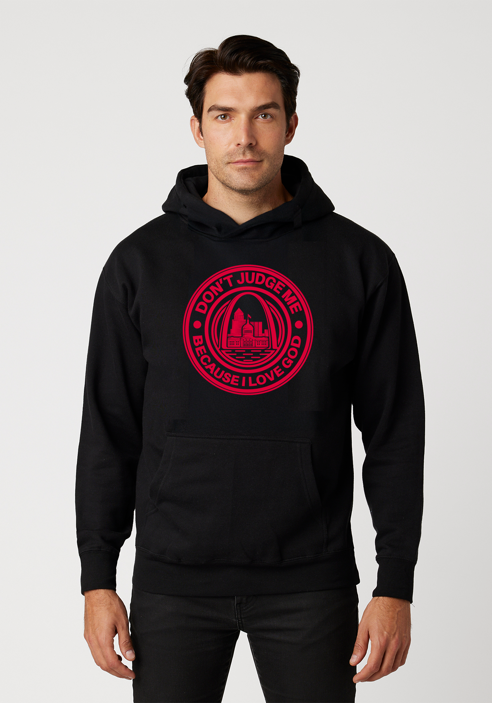 This premium unisex hoodie brings together the iconic Gateway Arch with a bold message of belief. Featuring our signature “Don’t Judge Me Because I Love God” statement, this piece represents faith, resilience, and real life — all while repping The Lou.